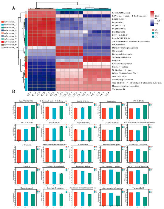 The differential metabolites of the three Cordyceps were analyzed and evaluated by a hierarchical cluster analysis (HCA). Among the many differential metabolites, we visualized the top 25 differential metabolites and found that they were divided into 10 subclusters (Figure 5A), and the 10 subclusters are shown in Table S4. The results showed that many differential metabolites belonging to the superclass of lipids and lipid-like molecules were significantly overexpressed in CS. Compared with the other two groups of samples, the expression of lipid metabolites such as LysoPC(18:1/0:0), (2E,4E)-Hexa-2, 4-Dienedioylcarnitine, PA (18:3/18:1), Isoetharine, PC (18:2/0:0), and PA (18:3/18:1) was significantly higher than CC and CM (Figure 5B), while the oleuropein of the terpene glycosides and sesquiterpenoids belonging to terpene glycosides were significantly overexpressed in the CM samples. In addition, poncirin and N-oleoyl histidine in flavonoid glycosides, peptides, and analogs were found to have a significantly higher abundance in CC than in the other two samples. Notably, N-linoleoyl lysine, DG (a-21:0/0/20:4-2OH), and gluconic acid were significantly overexpressed in CC and CM. N-Linoleoyl Leucine; carbohydrates; carbohydrate conjugates of amino acids, peptides, and analogs; Tuliposide B; hydroxypropionylcarnitine; and 3-beta-Hydroxy-17-(1H-imidazol-1-yl) androsta-5,16-diene on androstane steroids have a high abundance in CM and CC. In summary, the differences in the metabolites of the three Cordyceps mainly exist in lipids and amino acids, which provides new insights for us to search for suitable biomarkers to distinguish.