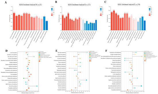 (A–C) KEGG enrichment analysis. The horizontal coordinate represents the pathway name, and the vertical coordinate represents the enrichment rate, which represents the ratio of the metabolite number enriched in this pathway to the background number annotated in the pathway. The larger the ratio, the greater the degree of enrichment. The column color gradient indicates the significance of enrichment. The darker the default color, the more significantly enriched the KEGG term, where the p-value or FDR < 0.001 is marked ***, the p-value or FDR < 0.01 is marked **, and the p-value or FDR < 0.05 is marked *. (D–F) KEGG pathway differential-abundance-score maps. The horizontal coordinate represents the DA score and the vertical coordinate represents the KEGG metabolic pathway name. DA score reflects the overall change in all metabolites in the metabolic pathway. A score of 1 indicates that the expression trend of all annotated differential metabolites in the pathway is upregulated; −1 indicates that the expression trend of all annotated differential metabolites in the pathway is downregulated; and the length of the line segment indicates the absolute value of DA score. The size of the dot indicates the number of differential metabolites annotated in the pathway, and the larger the dot, the more differential metabolites in the pathway. The dot distribution on the right side of the central axis and the longer line segment indicate that the overall expression of the pathway tends to be upregulated. The dots are distributed to the left of the central axis, and the longer the line segment, the more inclined the overall expression of the pathway is to downregulate. (A,D) CM vs. CC. (B,E) CS vs. CC. (C,F) CS vs. CM.
