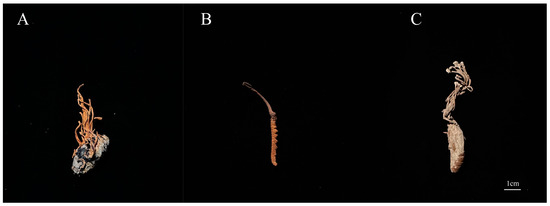 The specimens of mature Cordyceps. (A) C. militaris. (B) C. sinensis. (C) C. cicadae.