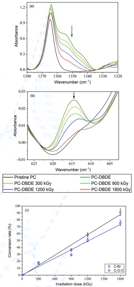 FTIR spectra of PC-DBDE as a function of EB dose: (a) evolution of the C-O-C ether band of DBDE between 1335 and 1380 cm−1; (b) evolution of the aromatic C-Br band of DBDE between 605 and 625 cm−1; (c) DBDE conversion rates for C-Br and C-O-C bands. The arrows were added to emphasize the decrease in the investigated bands and the lines represent guides for the eyes.