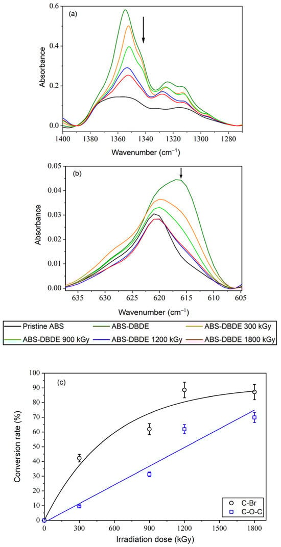 FTIR spectra of ABS-DBDE as a function of EB dose: (a) evolution of the C-O-C ether band vibration of DBDE between 1280 and 1390 cm−1; (b) evolution of the aromatic C-Br band vibration of DBDE between 605 and 635 cm−1; (c) DBDE conversion rates for C-Br and C-O-C bands. The arrows were added to emphasize the decrease in the investigated bands and the lines represent guides for the eyes.