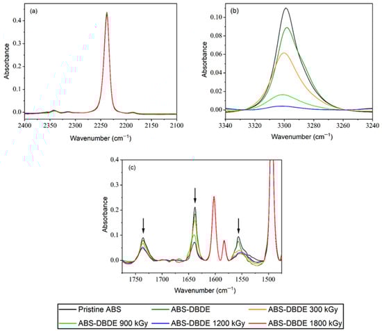 FTIR spectra of ABS-DBDE as a function of EB dose: (a) C≡N band vibration of ABS around 2250 cm−1; (b) N-H band vibrations of polymer additives between 3240 and 3340 cm−1; (c) N-H band vibrations of polymer additives between 1475 and 1775 cm−1. The arrows were added to emphasize the decrease in the investigated bands.