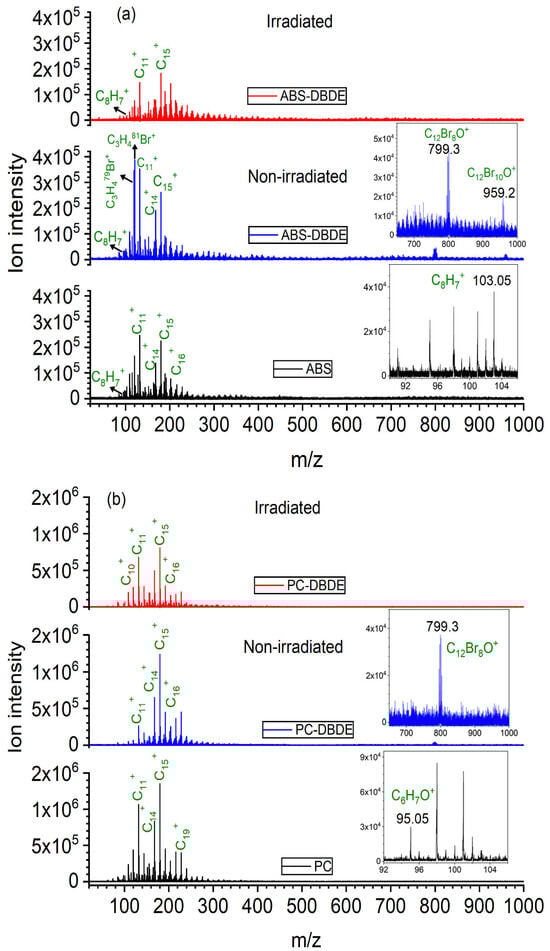 Positive ion mode mass spectra: (a) Comparison of HR-L2MS spectra of pure ABS (black color), non-irradiated (blue color) ABS-DBDE, and irradiated ABS-DBDE 1800 kGy (red color); (b) Comparison of HR-L2MS spectra of pure PC (black color), non-irradiated (blue color) PC-DBDE, and irradiated (red color) PC-DBDE 1800 kGy.