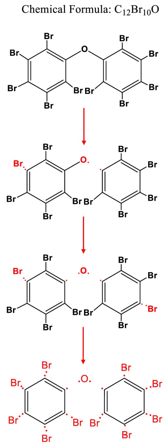 The FTIR and HR-L2MS results suggest the degradation of DBDE occurs through simultaneous scission of C-O-C and C-Br bonds. Figure 8 illustrates the successive stages of DBDE degradation induced by EB irradiation.