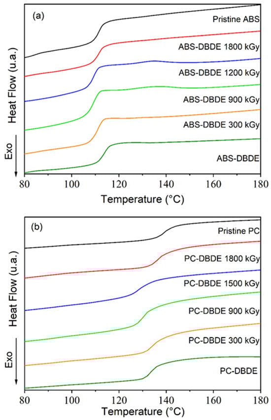 A DSC analysis was conducted to examine the thermal properties of ABS-DBDE and PC-DBDE before and after irradiation. Figure 9a displays the thermograms acquired for the unaltered ABS, ABS-DBDE, and EB-irradiated ABS-DBDE at varying doses. On the other hand, Figure 9b depicts the corresponding scenario for PC. The detection of a single glass transition (Tg) in each sample indicates the lack of phase separation effects. Interestingly, the addition of DBDE to virgin ABS causes a small change in Tg (Figure 9a), which is unlike the case of PC-DBDE where the incorporation of DBDE results in a significant change in Tg (Figure 9b).