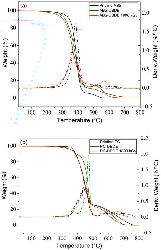 Figure 10b displays TGA curves for pristine PC, PC-DBDE, and PC-DBDE 1800 kGy. In contrast to the ABS case, the degradation curve of unaltered PC displays a diminished thermal stability in comparison to PC-DBDE, at least during the initial stage.