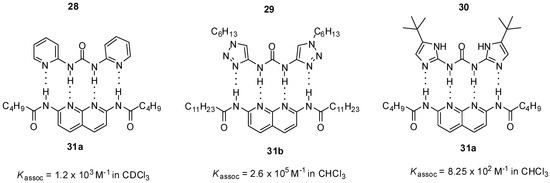 N,N’-bis-heterocyclic derivatives of urea can form heterodimers with diamido-naphthyridines through ADDA-DAAD binding motifs. Association constants were shown to depend strongly on the nature of heterocycles. The triazolyl derivative 29 formed a much more stable complex [48] than the pyridine analog 28 (Figure 9) [34,48], similarly to the difference in the behavior of the compounds with one heterocyclic ring 19 (Figure 7) and 26 (Figure 8). At the same time, unexpectedly, a weaker interaction was observed for ureido-diimidazole 30 [49], possibly due to several factors, such as energetically favored formation of a folded conformer, differences in shape complementarity between the two monomers and higher potential for self-association of 30.