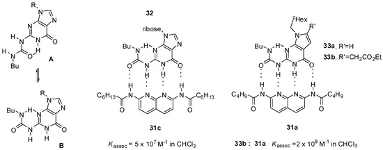 An exceptionally high association constant was measured for a ureido-guanosine-diamido-naphthyridine complex (32:31c, Figure 10) held together by four hydrogen bonds with ADDA-DAAD pattern [50]. The guanosine derivative showed only weak self-association (with Kdim around 230 M−1), in contrast to deazapterin (8, Scheme 3) and ureido-pyrimidine (Scheme 1) derivatives. According to NMR measurements, ureido-guanosine undergoes a conformational change from the more stable unfolded conformer (A) to the folded form (B) prior to complexation.
