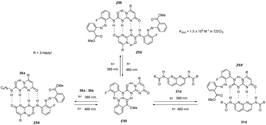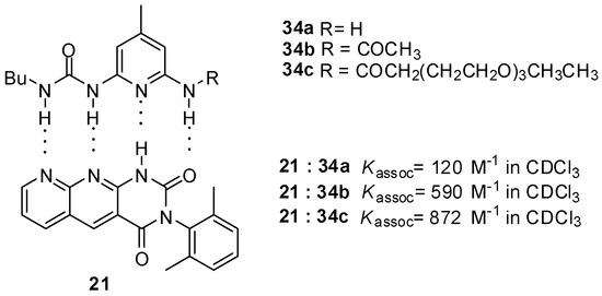 Similarly to the formation of homodimers, the value of binding constants was influenced considerably by the change of the substituents. Stronger binding of monomers with DDAD/AADA patterns was observed for acylated derivatives 34b,c (Figure 11) than for the amino compound 34a due the more acidic NH of the amides [53]. At the same time, these values show still weaker binding compared to that between quadruply H-bonded complexes with ADDA-DAAD patterns. Although the number of positive and negative secondary interactions is the same in the former and in the AADA·DDAD pair, the difference might be explained by geometric effects, i.e., a weaker association due to an inward curvature of the AADA counterpart 21 [5].