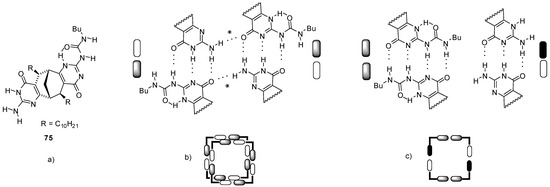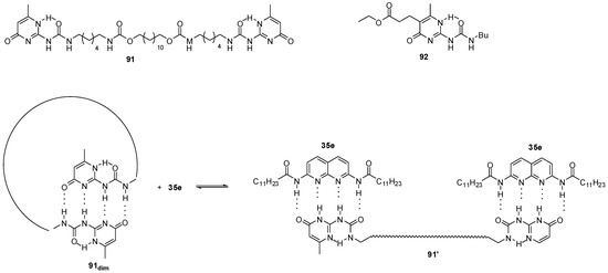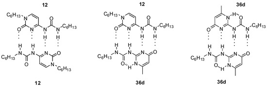Heterodimers (12:36d, Figure 14) were present in a considerable amount in the 1:1 mixture of self-associating ureido-cytosine (12, Kdim > 9 × 106 M−1 in C6D6) and ureido-pyrimidinone (36d) derivatives (ratio 5:6:5), which shows the strength of interaction between the two different monomers [38].