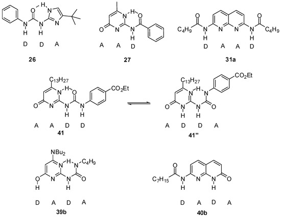 Wilson and co-workers investigated urea derivatives with an imidazolyl group. Although compound 26 can adopt two different conformations stabilized by internal H-bonds, both of them show the same ADD binding pattern and can form heterodimers with amido-isocytosines (e.g., 27). This leads to a nearly three order of magnitude stronger complexation than that of the analogous pyridine derivative. (e.g., 19, Figure 7) [41,46]. With the use of ditopic ureido-imidazole and amido-isocytosine motifs, heterodimers held together by six hydrogen bonds were also constructed [47].