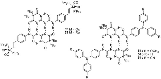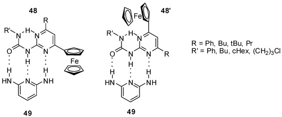 Similarly to simple derivatives, ureidopyrimidin-4,6-diones (e.g., 46, Figure 16) and -pyrimidin-4-ones (e.g., 47) decorated with ferrocenyl moieties were found to form stable dimers in apolar solvents, such as CDCl3 or CD2Cl2, and were shown to exist as monomers (in the case of 47, in the pyrimidin-6[1H]-one form 47′) in polar media, e.g., in DMSO-d6 and CD3CN, as supported by NMR measurements [63,64].