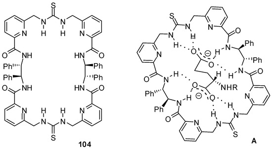- Ragusa, A.; Rossi, S.; Hayes, J.M.; Stein, M.; Kilburn, J.D. Novel enantioselective receptors for N-protected glutamate and aspartate. Chem. Eur. J. 2005, 11, 5674–5688. [Google Scholar] [CrossRef] [PubMed]