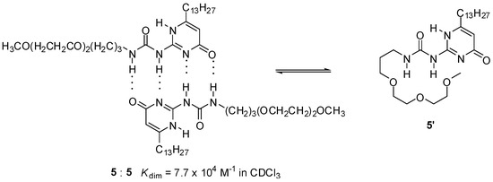 The presence of polar groups can also influence association strength considerably. Lower values of Kdim for UPys with oligo(ethylene oxide) side chains of a certain size (e.g., 5, Scheme 2), compared to those with aliphatic groups, were attributed to a competitive intramolecular hydrogen bonding of an oxygen atom of the side chain, resulting in a backfolding of the chain to the polar groups of the 2-ureido-pyrimidinone moiety [31].