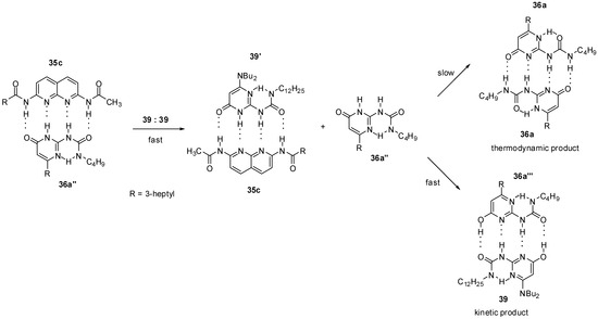 The thermodynamically disfavored heterodimer (36a‴:39, Scheme 8) could be obtained as a kinetic product by mixing the 2,7-diamido-1,8-naphthyridine (35c): ureido-pyrimidinone (36a″) heterodimer with the homodimer of the 6-amino-ureidopyrimidinone derivative 39 [30]. In addition, 36a was shown to be released from dimer 35c:36a″ in the pyrimidin-6[1H]-one form (36a″) that could rapidly turn into its tautomeric enol form (36a‴) via an [1,3]-shift and is associated with 39. The formation of the pyrimidin-4[1H]-one (36a) homodimer would require both a [1,3] proto-tropic shift and the break of an intramolecular hydrogen bond, so it is a much slower process.