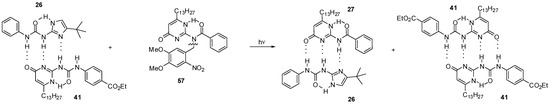 A four-component molecular cascade was built by Wilson et al. [57]. The formation of two heterodimers (26:27 and 31a:41″) as the main products was observed in the equimolar mixture of ureido-imidazole 26, amido-cytosine 27, a bis-amido-naphthyridine (31a) and ureido-pyrimidinone 41 (Figure 15). The two heterodimers could also be obtained upon sequential addition of 26 → 27 → 31a to the UPy homodimer 41:41. From the results, it was concluded that product distribution was not governed solely by the value of association constants and the main driving force in determining product distribution was to maximize non-covalent interactions in the entire system. At the same time, it is advantageous if one of the components recognizes a limited number of other derivatives (in the present case, compound 27).