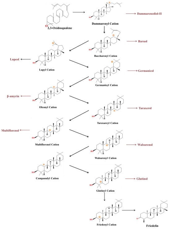 In the second phase, oxidosqualene is protonated by oxidosqualene cyclases followed by cyclization, rearrangements, and deprotonation to synthesis friedelin [51,86]. Further, oxidosqualene cyclization begins with carbocation, which undergoes multiple rearrangements to generate various compounds. In the pathway, 2, 3-oxidosqualene converted into dammarenyl cation followed by baccharenyl cation, lupyl cation, Germanioyl cation, oleamyl cation, taraxaeyl cation, multiflorenol cation, Walsurenyl cation, companulyl cation, glutinyl cation, friedenyl cation, and finally friedelin (Figure 2).