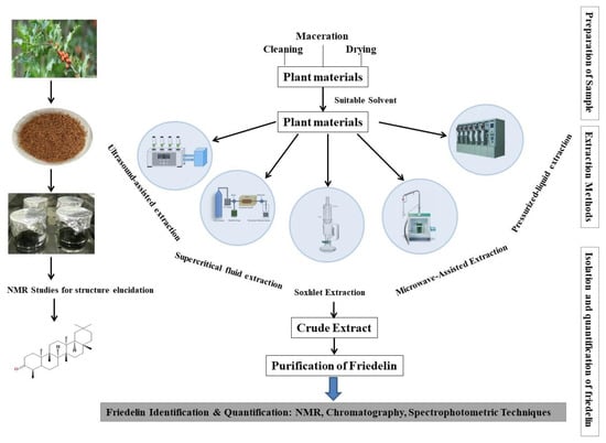 Supercritical fluid extraction (SFE) is an environmentally friendly and selective method to obtain plant extracts [91,92]. de Vasconcelos et al. [90] used a modified supercritical fluid extraction-CO2 method in which plant material was extracted with CO2 modified with methanol (10% v/v), ethanol (10% v/v), or pentane (10% or 20% v/v). They found that SFE CO2 modified with 10% methanol and SFE CO2 modified with 10% ethanol had the highest concentration of friedelin with 6.10 ± 0.75 mg/g plant material and 6.00 ± 0.97 mg/g plant material, respectively, as compared to SFE CO2 modified with 10% pentane, which had a friedelin yield of 3.00 ± 0.90 mg/g plant material, whereas SFE CO2 modified with 20% pentane had a friedelin yield of 3.70 ± 0.98 mg/g plant material [90]. De Melo et al. [86] used pure and ethanol-modified CO2 for the extraction of friedelin by the supercritical fluid extraction method. Different particle size (coarse particles to >80 mesh size) and ethanol (CO2 modifier) content (0–5 wt.%) in a 0.5 L capacity unit, at 300 bar, 50 ºC, and a CO2 flow rate of 11 g/min was used for the total (ηtotal) and friedelin (ηfriedelin) extraction. In this extraction method, they found that intermediate granulometries (40–60 mesh to 60–80 mesh) and a CO2: EtOH ratio 95.0: 5.0 wt% with 300 bar pressure enhance the friedelin selectivity by up to 2.6 times [86].