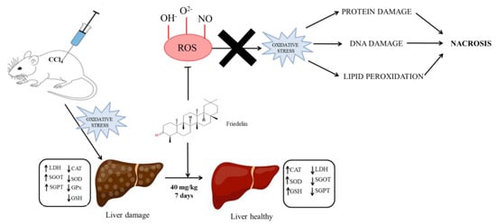 Under physiological conditions, the body maintains a balance between the production and elimination of free radicals. Excessive free radicals damage cellular proteins, membrane lipids, and nucleic acids, causing lipid peroxidation [98]. The antioxidant and hepatoprotective activity of friedelin is shown in Figure 4. Friedelin isolated from Azima tetracantha Lam. leaves sowed a free radical scavenging effect on 2,2-diphenyl-picrylhydrazyl (DPPH), nitric oxide, hydroxyl, and superoxide radical with IC50 values of 21.1 mM, 22.1 mM, 19.8 mM, and 21.9 mM, respectively [99]. Friedelin (25 μg/mL) isolated from Holothuria scabra showed 90.22 ± 0.15% DPPH free radical scavenging activity with an effective concentration (EC50) value that was found to be 14.63 ± 0.01μg/mL [19]. Friedelin isolated from the ethyl acetate extract of the stem of Tapinanthus bangwensis showed 73.69% free radical scavenging activities comparable to 93.96% by ascorbic acid [20].