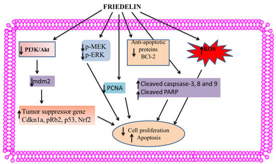 Malignant breast cancer affects 18% of the world’s population and is the second leading cause of mortality for women [15,76]. An upregulation of estrogen receptors has been observed in several instances of breast cancer. Friedelin extracted from Hopea odorata demonstrated a −4.710 docking score with estrogen receptor alpha (ER-α) [76]. An in vitro cytotoxicity study of friedelin in human breast cancer cells (MCF-7) showed dose- as well as time-dependent inhibition of breast cancer proliferation [15]. Friedelin had an IC50 value of 0.51 μg/mL after 48 h for MCF-7 without causing any cytotoxicity in Vero and V79 cells. Friedelin caused DNA damage with significantly increased ROS levels. After 48 h of 1.2 μM friedelin treatment, Cdkn1a, pRb2, p53, Nrf2, and caspase-3 were upregulated, while Bcl-2, mdm2, and PCNA were downregulated, confirming apoptosis [15].