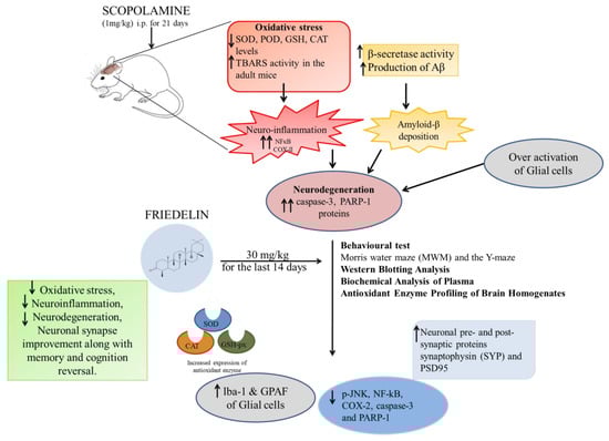 Oxidative stress (OS) along with c-Jun N-terminal kinase (JNK) have been significant factors involved in neuroinflammatory signaling pathways as well as their associated neurodegenerative disorders. Sandhu et al. [23] tested the friedelin neuroprotection effect. Friedelin exhibited a protective effect against scopolamine-induced oxidative stress, neuro-inflammation, glial cell activation, and p-JNK as well as NF-κB and their downstream signaling molecules. Friedelin was found to enhance neuronal synapse and improve memory deficits induced by scopolamine through the inhibition of β-secretase enzyme (BACE-1) and amyloidogenic pathways [23] as shown in Figure 8.