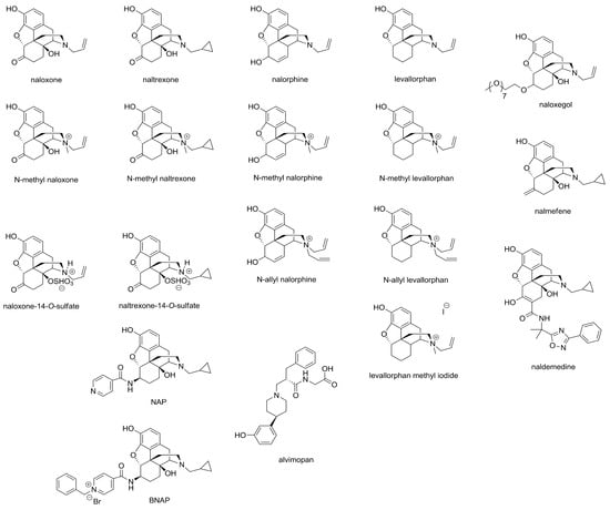 Another strategy for developing peripheral MOR antagonists entails the synthesis of the 6β-N-heterocyclic-substituted naltrexamine derivative NAP, which has been reported to produce a measurable increase in the intestinal motility of morphine-treated mice [69,70]. In fact, some of these analogs, such as BNAP, showed an affinity for more than one opioid receptor subtype [71]. Kanemasa and co-workers reported that naldemedine, in certain doses, inhibits OIC without affecting analgesia or withdrawal in rats. The measured effect in this study was attributed to MORs, because the applied agonists were MOR-selective agonists, though naldemedine has displayed comparable affinity for MOR, DOR, and KOR in receptor binding assays [72]. Likewise, naloxegol, a pegylated derivative of naloxone, can antagonize the OIC in rat experiments where morphine was the test agonist [73]. Alvimopan is a fully synthetic zwitterionic piperidine derivative that is structurally completely different from other clinically used opioid antagonists. Based on affinity studies, alvimopan has been proven to be a MOR antagonist displaying an affinity five times higher for MOR and five times lower for both DOR and KOR than naloxone. The route of administration of alvimopan dictates its site-of-distribution profile within the peripheral tissue, namely peripheral tissues or the entire gastrointestinal tract when administered s.c. or orally, respectively [74,75]. Furthermore, zwitterionic opioid antagonists, namely naloxone-14-O-sulfate and naltrexone-14-O-sulfate have also been reported previously; however, their impact on OIC, to the best of our knowledge, has not yet been elucidated [76,77].