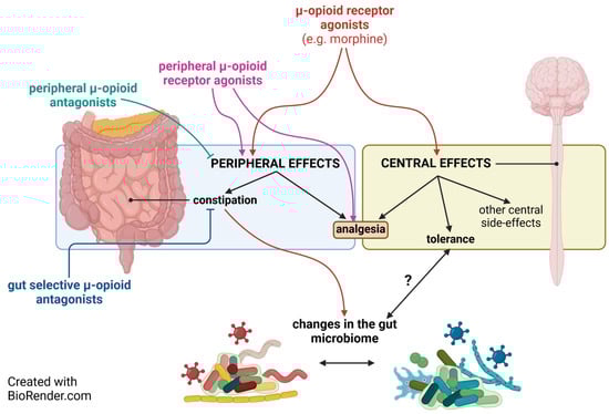 Opioid agonists exert their antinociceptive actions through the activation of opioid receptors, particularly µ-opioid receptors (MORs), both peripherally and centrally (spinal and supraspinal MOR activation) [2]. Although the site of action of clinically available analgesics is considered to be central, MOR-mediated peripheral analgesia has also been identified in human and experimental pain models [3,4,5,6,7,8,9,10]. The current consensus is that opioid agonists are the most effective analgesics for treating mild to severe acute and chronic pain types, yet in the case of neuropathic pain, their effect is up for debate [11,12,13]. The peripheral distribution of MORs is not limited to the peripheral sensory fiber terminals that mediate peripheral antinociception, and they are also found in other tissues including the gastrointestinal tract where they can mediate constipation [14,15,16]. Activation of gastrointestinal MORs has advantageous therapy properties related to the treatment of diarrhea. However, MOR activation has also been identified as being implicated in the development of gastrointestinal dysbiosis, an imbalance in microbiome composition [17,18,19]. Recent data have indicated that opioid-induced dysbiosis (OID) is associated with the development of opioid analgesic tolerance, opioid-induced hyperalgesia, and the progression of chronic pain conditions such as neuropathic pain [4,20,21,22]. More recently, the notion of the role of peripherally acting opioid antagonists in improving the antinociceptive effects of opioid agonists by reversing opioid analgesic-induced alterations in the gastrointestinal microbiome has been proposed. Indeed, proposed mechanisms of OID are varied, including opioid-induced constipation (OIC) (for review see Zádori et al., 2022 [23]). This reflects the fact that, despite the greater use of opioid agonists for the treatment of pain, opioid antagonists have also gained relevant practical use in the clinical world such as in the present context of OID and OIC, among others, in relation to opioid overdose, opioid and/or alcohol maintenance treatment, and obesity. This review will pay attention to the pharmacology of opioid antagonists, including peripherally acting opioid antagonists, and their benefits for animals and human subjects complaining of OIC as a result of the activation of gastrointestinal MORs and its consequences, as covered in detail in Section 2. In addition, it will shed light on the hallmarks of relationships between antagonist treatment and the composition of the gastrointestinal microbiome as seen in OIC. This review will also discuss the association between direct and indirect anti-opioids and the gut microbiome under the condition of opioid treatment. Furthermore, the review aims to find an alternative and complementary avenue that identifies and develops peripherally selective opioid antagonists that overcome the adverse gastrointestinal effects of MOR analgesics, particularly OIC, without impacting either the central opioid analgesia or peripheral analgesia, which is still the subject of current and future research. In this context, we present a scenario-based overview related to the concepts of developing opioid antagonists in order to overcome OIC and its consequences on the intestinal microbiome and pain. Finally, the impact of food-derived opioids and probiotics on gut dysbiosis, when simultaneously taken with these antagonists, are also discussed.