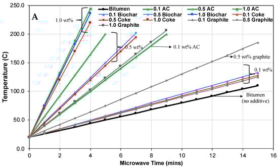 In the absence of a carbon susceptor, bitumen reached a peak temperature of 125 °C after 15 min of microwave heating (heating rate of 6 °C/min). Conversely, the addition of a small quantity of 0.1 wt% of activated carbon (AC) allowed the bitumen sample to hit the 200 °C mark within 9 min, enhancing the heating rate to 20.8 °C/min. By increasing the AC concentration, the time to reach 200 °C was significantly reduced, taking only 5 min at 0.5 wt% and 4 min at 1.0 wt% AC.
