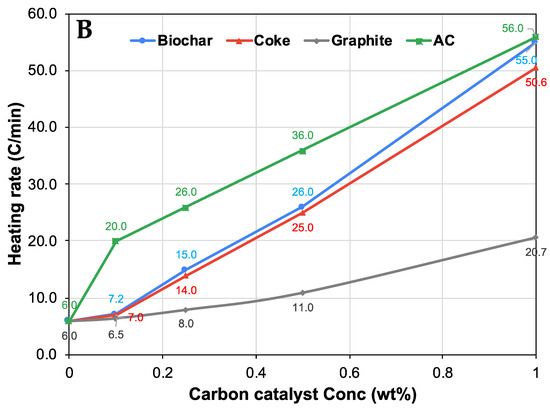 (A) Bitumen recorded temperatures with carbon susceptors at different concentrations. (B) The effect of different carbon susceptor concentrations on heating rates.
