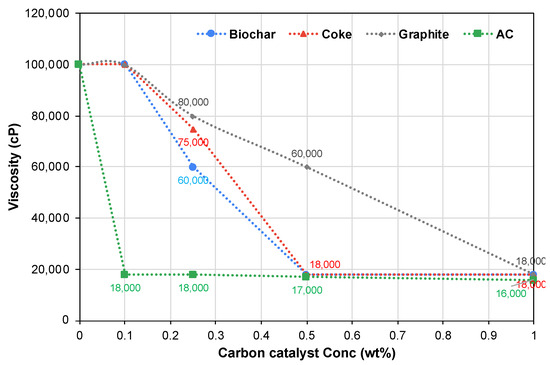 Graphite, however, required a higher concentration—1.0 wt%—for maximum viscosity reduction, double that of biochar or coke and ten times that of AC. The variation in the optimum susceptor concentrations could be attributed to differing trace metal contents within the carbon particles, impacting their catalytic and microwave absorption abilities, or to the surface area and pore volume associated with each particle, affecting the susceptors’ surface properties and microwave radiation absorption abilities. These aspects are further explored in subsequent sections of this paper.