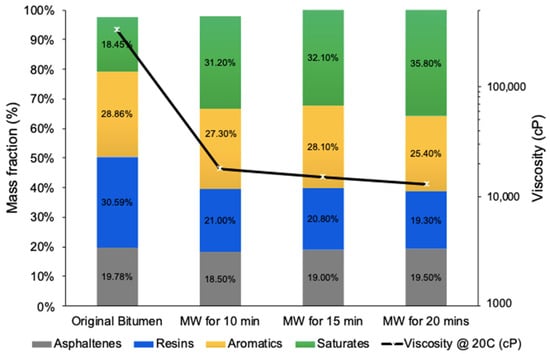 Figure 4 depicts the correlation between viscosity and SARA compositional changes concerning microwaving time. An irradiation duration of 10 min resulted in a dramatic viscosity reduction from 100,000 cP to 18,000 cP, translating to an 82% decrease. Extending the microwaving time by an additional 5 min (totaling 15 min) incrementally enhanced viscosity reduction, reaching a new viscosity of 15,000 cP and an overall reduction of 85%. Further extending the microwaving time to 20 min resulted in a viscosity of 13,000 cP and a maximum reduction of 87%. These data suggest that the majority of thermal cracking reactions transpire within the initial 10 min of microwave irradiation, with any extension beyond this duration offering negligible improvements as viscosity values plateau.