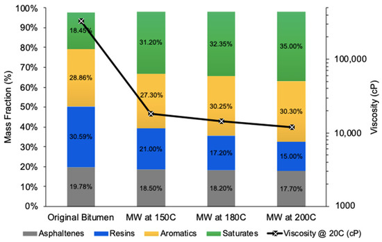 In this phase of the investigation, the impact of different maximum microwave temperatures on the upgraded oil was evaluated. The maximum reaction temperature was varied within the range of 150–200 °C, while the reaction time was fixed at 10 min. Figure 5 illustrates the viscosity and SARA compositional changes in relation to the microwave temperature. The findings indicate that a reaction temperature of 150 °C facilitated a reduction in bitumen viscosity from 300,000 cP to 18,000 cP, signifying a 94% decrease. Increasing the maximum reaction temperature to 180 °C further reduced viscosity to 14,500 cP, marking a 95.2% reduction. Finally, pushing the microwaving temperature to 200 °C led to a viscosity of 11,000 cP, equating to a final viscosity reduction of approximately 96%.