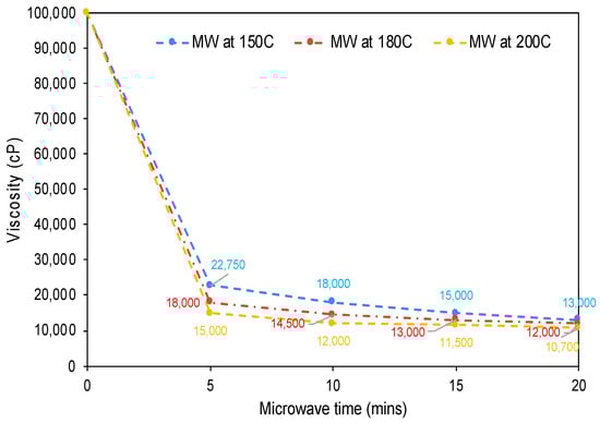 Figure 3 outlines the viscosity changes for the upgraded oil samples at different carbon susceptor concentrations under microwave irradiation. After reaching 150 °C, or the maximum feasible temperature for samples with lower carbon susceptor concentrations, the samples were maintained at that temperature for 10 min. Viscosity measurements were taken three times for each condition at room temperature (20 °C), and the average values are presented in Figure 3.