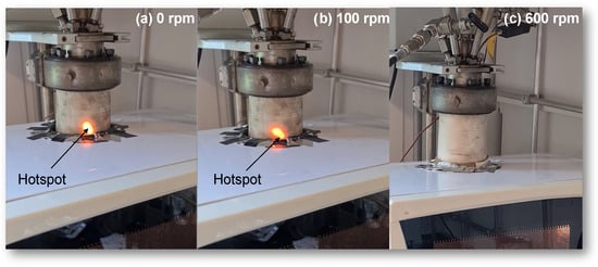 In this section, the effect of the stirring rate on both the heating progression and the extent of cracking reactions is explored. The visibility of hotspots within the light-colored PTFE reactor provided real-time observations during microwave irradiation at different stirring rates, as depicted in Figure 7. Without stirring (0 rpm) or with slow stirring (100 rpm), the formation of orange-colored hotspots was conspicuous. However, a surge in the stirring rate gradually diminished both the number and intensity of these hotspots, which were rendered undetectable at a rapid stirring rate of 600 rpm. The emergence of such hotspots is due to microwave radiation reflection off the surface of the activated carbon within the oil, a phenomenon also observed in Horikoshi et al.’s study [26]. The temperature of these hotspots can reach an impressive 900 °C, as noted in certain studies [26].