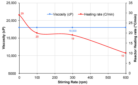 The stirring rate’s impact on the heating progression of the bitumen samples is illustrated in Figure 8. An increased stirring rate resulted in a slower heating progression. While the heating rate remained relatively constant within the slow-to-medium stirring speeds (100–300 rpm), it experienced a significant drop when the stirring rate exceeded 300 rpm, bottoming at a heating rate of 10 °C/min at 600 rpm. The rapid rotation probably limits the opportunity for microwave radiation to engage with the carbon surface, reducing absorption and reflection, and leading to a longer heating period.