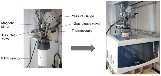 Moreover, it is important to note that, in microwave-assisted processes, the reactor’s fabrication material plays a critical role due to its interaction with microwaves. Therefore, Polytetrafluoroethylene (PTFE), a microwave-transparent plastic, was chosen for this study over other potential materials, such as glass or ceramic. PTFE offers superior chemical resistance, physical durability, and ease of cleaning, in addition to its resilience to sudden thermal shocks. While PTFE starts to degrade at temperatures higher than 260 °C, this is not a concern for this study, as we made sure that the oil temperature did not exceed 200 °C, providing a safety margin of 60 °C. Temperature measurements during the microwave irradiation process were conducted using a carefully shielded fiber optic temperature sensor (FOTS). The sensor was precisely positioned within the PTFE reactor to ensure contact with the bitumen mixture, without touching the reactor’s sides. Before each experiment, the sensor was calibrated, with the temperature readings displayed in real-time during the irradiation process. This ensured that the microwaves interacted exclusively with the bitumen mixture, not the sensor. The agitation method involved a metallic stirrer, typically not recommended due to the potential for metal–microwave interactions. However, some measures were taken to mitigate such interactions. The stirrer was aligned parallel to the electromagnetic field, minimizing potential interference. In addition, the stirrer was designed with a smaller diameter and smoother surface to decrease the risk of arcing and heating by reducing the exposed surface area to the microwave field. Pictures of the experimental setup used in the microwave partial upgrading series of tests are shown in Figure 9.