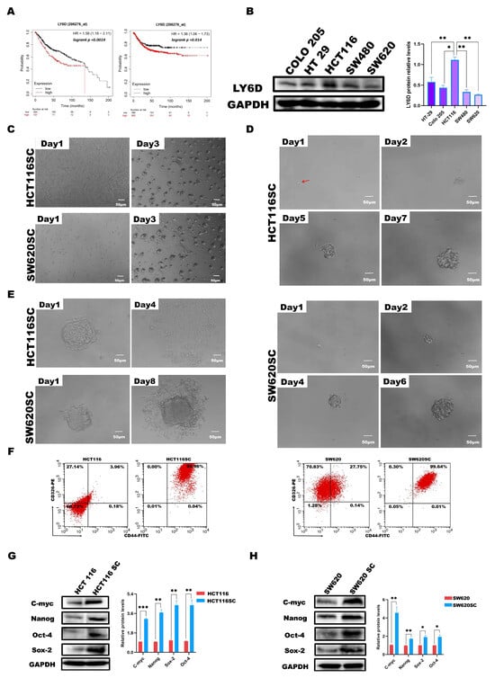 Effect of LY6D on the survival of patients with colon cancer (CC). Optical micrographs and identification of sorted colon cancer stem cells (CCSCs). (A) KM plotter survival curve showing the overall survival and the relapse-free survival of patients with CC based on high and low LY6D expression. (B) Western blot analysis of the relative protein levels of LY6D in various CC cell lines (* p < 0.05, ** p < 0.01, compared with HCT116 cells). (C) Culture of HCT116SCs and SW620SCs (sorted CCSCs from respective cell lines) in serum-free DMEM/F12 medium over three days. (D) Tumor sphere formation process from single cell of HCT116SCs’ and SW620SCs’ populations (The red arrow indicates the single-cell location). (E) Differentiation of CCSCs into adherent cells after induction with 10% FBS. (F) Flow cytometric analysis of the expression ratios of CD44 and CD326, comparing HCT116SCs and SW620SCs with HCT116 and SW620 cells. (G) The relative protein levels of c-Myc, Sox-2, Nanog, and Oct-4 in HCT116 and HCT116SCs’ populations were compared via Western blotting. (H) The relative protein levels of c-Myc, Sox-2, Nanog, and Oct-4 in SW620 and SW620SCs’ population compared via Western blotting; * p < 0.05, ** p < 0.01, *** p < 0.001.