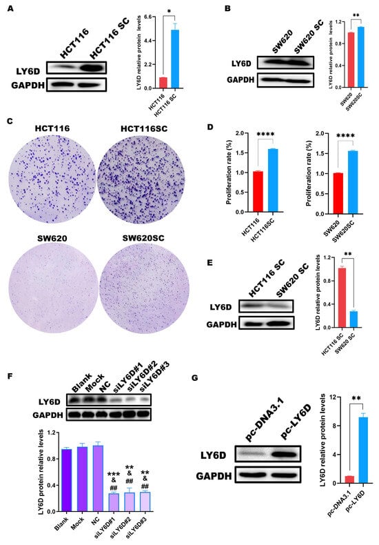 Expression of LY6D in colon cancer stem cells (CCSCs). (A) Western blotting results showing LY6D protein levels in HCT116 cells and HCT116SCs (stem cells) (* p < 0.05, compared with HCT116). (B) Western blotting results showing LY6D protein levels in SW620 cells and SW620SCs (stem cells) (** p < 0.01, compared with SW620). (C) Representative colony formation assay results capture of HCT116 vs. HCT116SC and SW620 vs. SW620SC. (D) MTS assay results showed the proliferation capability of HCT116 vs. HCT116SC and SW620 vs. SW620SC (**** p < 0.0001, compared with HCT116SC or SW620SC). (E) Western blotting results showing LY6D protein levels in HCT116SCs and SW620SCs (** p < 0.01, compared with HCT116SCs). (F) Western blotting results showing LY6D protein levels in HCT116SCs after siLY6D transfection for 48 h (** p < 0.01, *** p < 0.001, compared with blank; & p < 0.05, compared with mock; ## p < 0.01, compared with negative control (NC)). (G) Western blotting results showing LY6D protein levels in SW620SCs after pc-DNA3.1-LY6D (pc-LY6D) transfection for 48 h (** p < 0.01, compared with pc-DNA3.1 transfection).