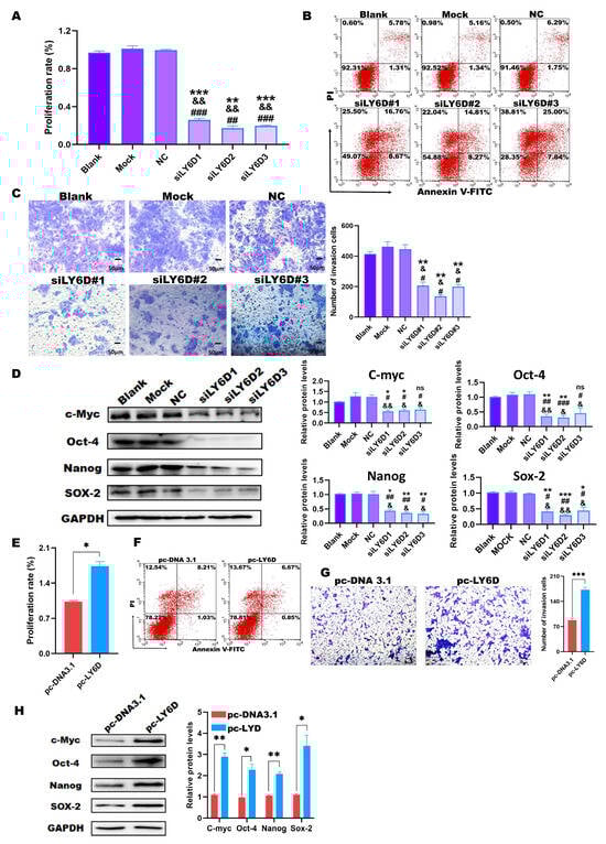 In vitro experiments to identify the relationship between LY6D and colon cancer stem cells (CSCCs) proliferation, apoptosis, and invasive capacity. (A) MTS assay showed the proliferation potential of HCT116SCs (stem cells) after siLY6D transfection for 48 h (** p < 0.01, *** p < 0.001, compared with blank; && p < 0.01, compared with mock; ## p < 0.01, ### p < 0.001, compared with negative control (NC)). (B) Flow cytometric analysis of Annexin V/PI staining to determine the percentage of apoptotic HCT116SCs after siLY6D transfection for 48 h. (C) Representative photographs of HCT116SCs that passed through the Matrigel after siLY6D transfection for 48 h in the Transwell invasion assay (** p < 0.01, compared with blank; & p < 0.05, compared with mock; # p < 0.05, compared with NC). (D) Relative protein levels and normalization of c-Myc, Sox-2, Nanog, and Oct-4 detected via Western blotting after LY6D down-regulation (* p < 0.05, ** p < 0.01, *** p < 0.001, compared with blank; & p < 0.05, && p < 0.01, compared with mock; # p < 0.05, ## p < 0.01, ### p < 0.001, compared with negative control (NC)). (E) MTS assay showed the proliferation potential of SW620 cells after pc-DNA3.1-LY6D (pc-LY6D) transfection for 48 h (* p < 0.05, compared with pc-DNA3.1 transfection). (F) Flow cytometric analysis of Annexin V/PI staining to determine the percentage of apoptotic SW620SCs after pc-LY6D transfection for 48 h. (G) Representative photographs of SW620SCs that passed through the Matrigel after pc-LY6D transfection for 48 h in the Transwell invasion assay. (*** p < 0.001, compared with pc-DNA3.1 transfection). (H) Relative protein levels and normalization of c-Myc, Sox-2, Nanog, and Oct-4 detected via Western blotting after LY6D up-regulation (* p < 0.05, ** p < 0.01, compared with pc-DNA3.1 transfection).