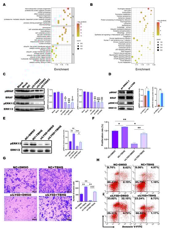 Bioinformatic analysis and validation of the regulatory effects of LY6D on colon cancer stem cells (CCSCs). (A) Gene Ontology (GO) enrichment analysis of differentially expressed genes (DEGs) following LY6D or control siRNA transfection for 48 h. (B) Kyoto Encyclopedia of Genes and Genomes (KEGG) enrichment analysis of DEGs following LY6D or control siRNA transfection for 48 h. (C) Western blotting results of pBRAF and pERK1/2 relative protein levels in HCT116SCs (stem cells) after siLY6D transfection for 48 h (* p < 0.05, ** p < 0.01, *** p < 0.001, compared with blank; & p < 0.05, && p < 0.01, &&& p < 0.001, compared with mock; # p < 0.05, ## p < 0.01, compared with negative control (NC)). (D) Western blotting results of pBRAF and pERK1/2 relative protein levels in SW620SCs after pc-LY6D transfection for 48 h (* p < 0.05, ** p < 0.01, compared with pc-DNA3.1 transfection). (E) Western blotting results of pERK1/2 relative protein levels in HCT116SCs after siLY6D transfection plus tert-butyl hydroquinone (TBHQ) treatment for 48 h assay (* p < 0.05, ** p < 0.01, *** p < 0.001). (F) MTS assay data for the proliferation potential of HCT116SCs after siLY6D transfection plus TBHQ treatment for 48 h assay (* p < 0.05, ** p < 0.01). (G) Representative photographs of HCT116SCs that passed through the Matrigel after siLY6D transfection plus TBHQ treatment for 48 h in the Transwell invasion assay (** p < 0.01, *** p < 0.001). (H) Flow cytometric analysis of Annexin V/PI staining to determine the percentage of apoptotic HCT116SCs after siLY6D transfection plus TBHQ treatment for 48 h.