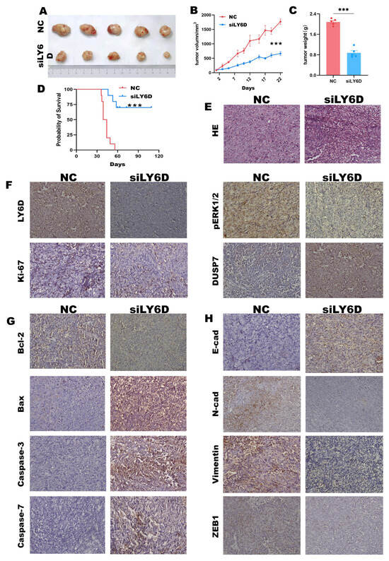 LY6D siRNA treatment suppresses xenograft tumor growth and prolongs mice survival rate. (A) Representative tumor photographs from HCT116SCs’ (stem cells) xenograft in mice following LY6D siRNA treatment for three weeks. (B) Tumor volumes of the HCT116SCs’ xenograft tumors from mice following LY6D siRNA treatment for three weeks (*** p < 0.001, compared with negative control (NC)). (C) Tumor weights of the HCT116SCs’ xenograft in mice following LY6D siRNA treatment for three weeks (*** p < 0.001, compared with NC). (D) Survival curve of mice with HCT116SCs’ xenograft after LY6D siRNA treatment for three weeks (*** p < 0.001, compared with NC). (E) Representative images of hematoxylin and eosin (HE) staining. (F) Representative immunohistochemistry (IHC) images of LY6D, pERK1/2, Ki67, and DUSP7. (G) Representative IHC images about apoptosis-related proteins. (H) Representative IHC images of EMT-related proteins.
