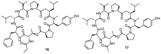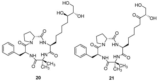 Subsequently, the antiplasmodial peptides kosidachin A (20) and kosidachin B (21) (Figure 7) were discovered by Watanabe et al. (2022) [10]. The compounds are cyclic tetrapeptides isolated from a culture broth of Pochonia binensis FKR-0564 by HPLC using Capcell Pak C18 column with an isocratic solvent system. Two new compounds were acquired from two fractions with retention times between 12.5–14.0 and 15.0–16.5 min.