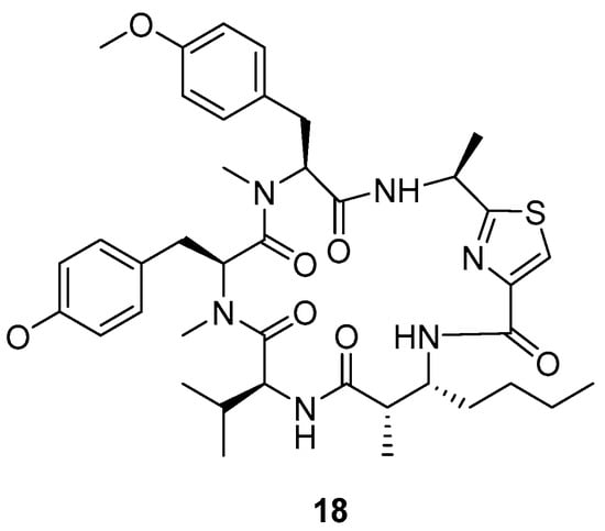 Another antimalarial peptide georatusin (22) (Figure 8) was isolated by Shi et al. (2018) from Geomyces auratus, which is a mesophilic fungus [11]. The ethyl extract was fractionated using a flash purification system with a gradient elution of n-hexane:acetone and purified by semipreparative HPLC on a RP-HPLC with C-18 to obtain georatusin.