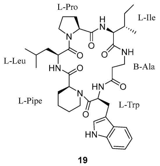 Another cyclic peptide with antimalarial activity called pipecolisporin (19) (Figure 6) was isolated in 2021 by Fernández-Pastor et al. from the endophytic fungus Nigrospora oryzae CF-298113 [9]. A scaled-up culture of Nigrospora oryzae CF-298113 was extracted using methyl ethyl ketone (MEK) in BRFT medium and then purified using reversed-phase C18 medium pressure chromatography followed by semi-preparative reversed-phase HPLC on a phenyl column applying isocratic elution of H2O-CH3CN as the mobile phase (3.6 mL/min; 32% CH3CN for 40 min; UV detection at 210 nm). Pipecolisporin (19) was obtained as an amorphous white powder.
