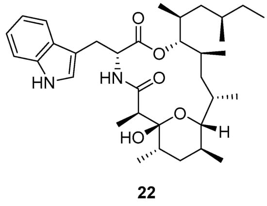 Two new cyclic octadepsipeptides octaminomycin A (16) and octaminomycin B (Figure 4) (17) discovered by Jang et al. (2017) exhibited activity against P. falciparum. The octadepsipeptides were isolated from a microbial metabolite fraction library of Streptomyces sp. RK85-270 based on Natural Products Plot (NPPlot) screening using liquid chromatography for extraction and purification [7].