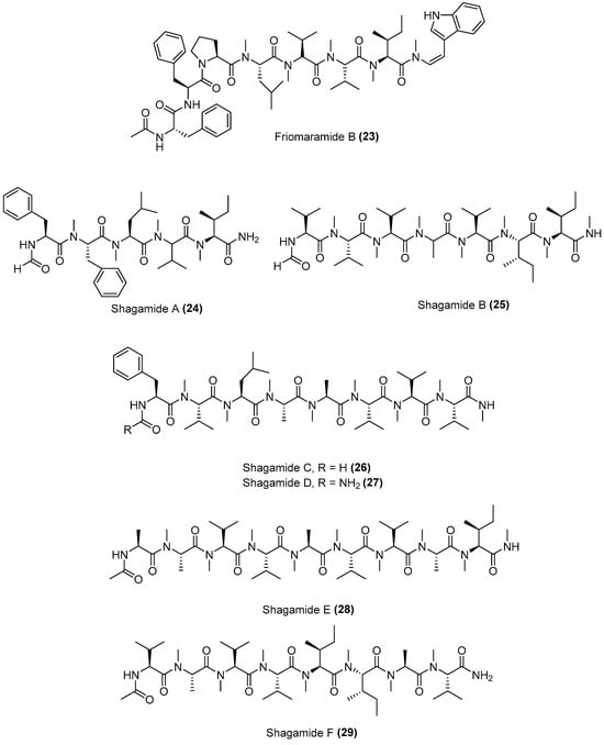 Some linear peptides have also been reported to be active against malaria parasite. N-methylated linear peptides friomaramide B and shagamides A-F were purified from the marine sponge Inflatella coelosphaeroide by Bracegirdle et al. in 2022 (Figure 9) [12]. A collection of I. coelosphaeroides sponge samples was extracted, mounted onto silica gel and then partitioned using NP flash MPLC before fractionation by semipreparative C18 HPLC using a linear gradient. The individual fractions were then purified again by C18 HPLC to obtain friomaramide B (23), shagamide A (24), shagamide B (25), shagamide C (26), shagamide D (27), shagamide E (28), and shagamide F (29).