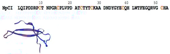 The derived putative 53-residue full protein sequence of NpCI and modelled folded of NpCI. The presence of six-cysteine (C) residues are highlighted in red.