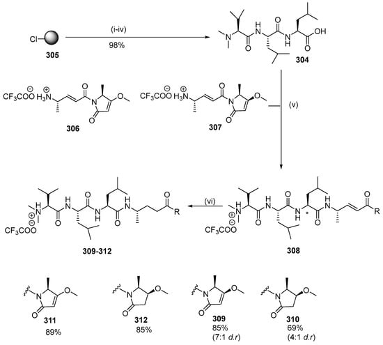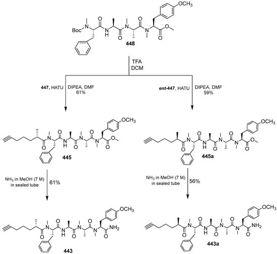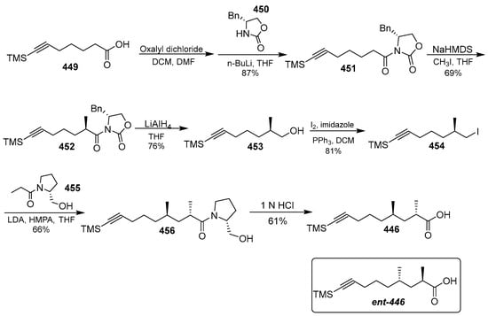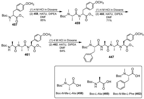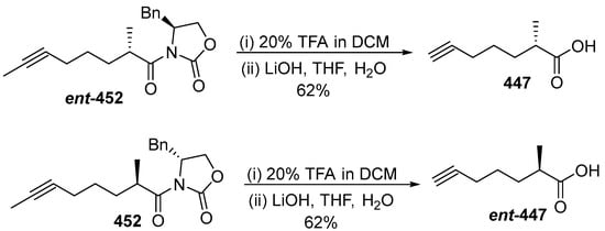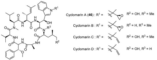 Cyclomarin A (46) (Figure 11) is a marine cycloheptapeptide with antimalarial activity that can be synthesized in an enantiomerically pure form [16]. Key steps in the synthesis of cyclomarin are asymmetric chelate−enolate Claisen rearrangement, asymmetric hydrogenation, and highly diastereoselective additions of organozinc and titanium reagents [16,17].