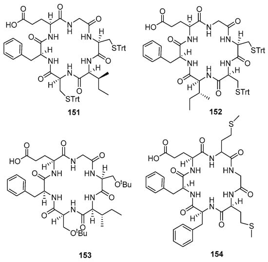 Eleven cyclic peptides (140–150) (Figure 12) were synthesized (23 to 63% yield) using method A (Table 2). Method B constructed Fmoc-L-Glu-OH and all amino acids on 2-CTC resin and the capping step took advantage of DIPEA and MeOH (Table 3). Reagent [Pd(PPh3)4] in a solution of 10% piperidine in THF was used to remove the Fmoc-protected amino acid at the N-terminal group and produce a free carboxyl group at the C-terminal. This method yielded four antimalarial cyclopeptides (151–154) (Figure 13). A comparison of these methods is provided in Table 4.