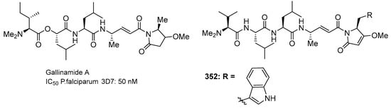 - Conroy, T.; Guo, J.T.; Elias, N.; Cergol, K.M.; Gut, J.; Legac, J.; Khatoon, L.; Liu, Y.; McGowan, S.; Rosenthal, P.J.; et al. Synthesis of gallinamide A analogues as potent falcipain inhibitors and antimalarials. J. Med. Chem. 2014, 57, 10557–10563. [Google Scholar] [CrossRef] [PubMed]